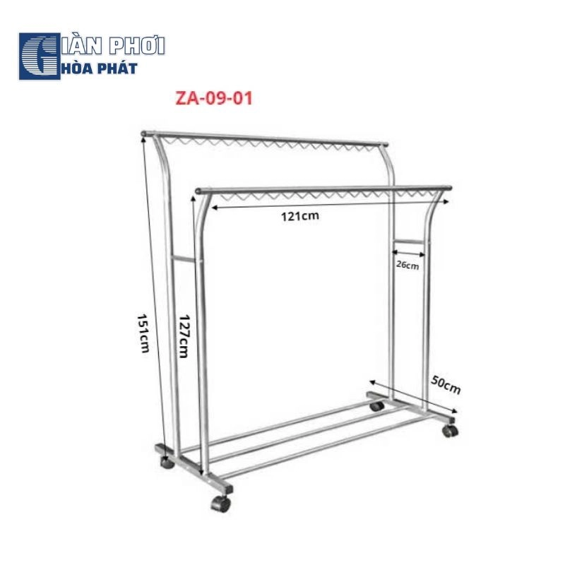 – Giá phơi ZA-09-01 là mẫu giá phơi kép và có móc treo giúp người dùng khi phơi quần áo được cố định không bị xê dịch và bị dồn với nhau.